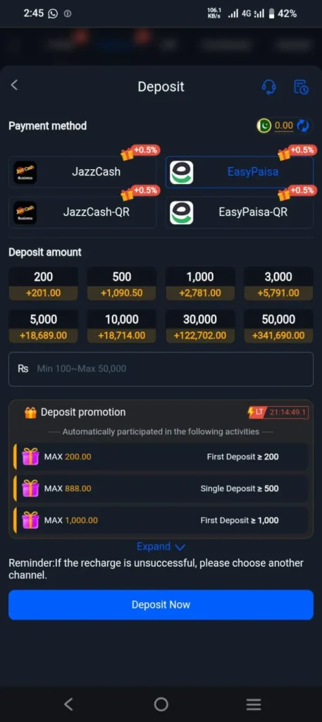 The online gaming app offers quick and easy local payment methods, including Jazz Cash, Easy Paisa account, and bank transfer.