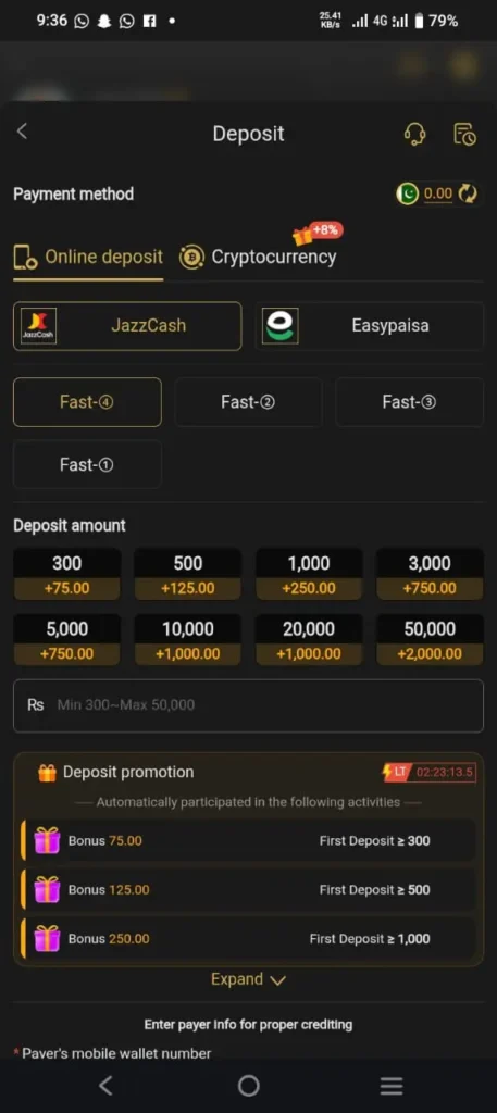The game supports local payment methods, including bank transfers, Jazz Cash, and Easy Paisa, making deposits and withdrawals quick and easy for players in Pakistan.