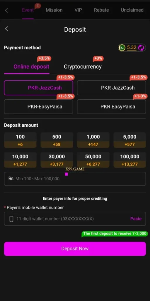This game has multiple payment methods. user chose their favorite options to withdraws their money. The payment methods include easy paisa jazz cash and bank transfer.