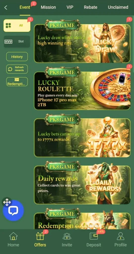The PK8 Game APK provides awesome rewards and bonuses to keep users engaged. Some common bonuses and rewards include: