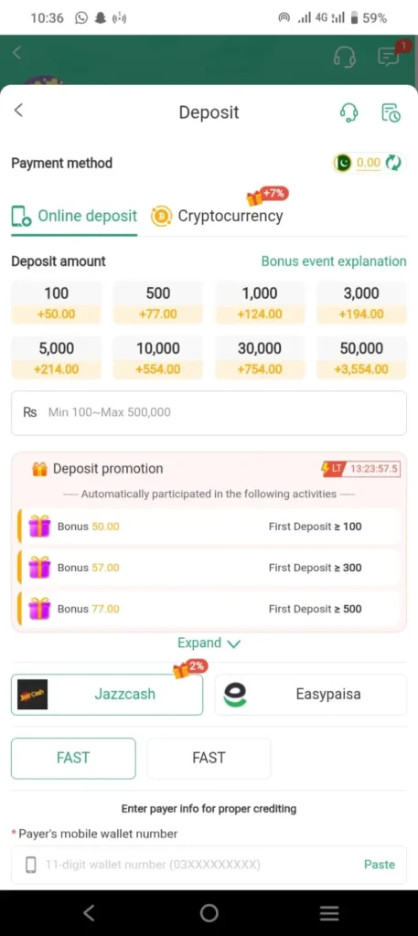 - Choose the deposit method like Easy Paisa or Jazz Cash